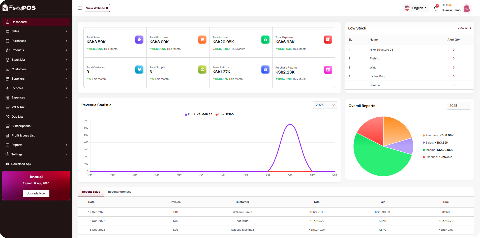 Track stock levels and receive low-stock alerts instantly.
